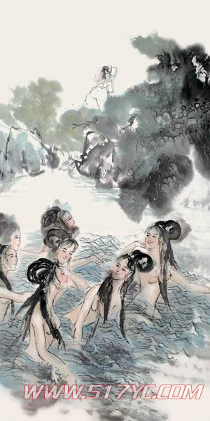 秀才知书达理,翩翩的风度,拂动了六仙女的爱心,她深情地望着秀才,双脚像是被钉在湖边一样。年轻的秀才更被六仙女的美貌所吸引,像呆鸡一样忘情地站着,逗得几位仙女忘记羞涩,嘻嘻笑了起来。