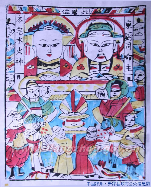 灶君神像,贴在锅灶旁边正对风匣的墙上。两边配联多为“上天言好事,下界保平安”,下联也有写成“回宫降吉祥”的。中间是灶君夫妇神像,神像旁边往往画两匹马作为坐骑。祭灶时要陈设供品,供品中最突出的是糖瓜。晋北地区习惯用饧,是麻糖的初级品,特粘,现在统称麻糖。有“二十三,吃饧板”的民谚。糖、饧之类食品既甜又粘。取意灶君顾了吃,顾不了说话,上天后嘴被饧粘住,免生是非。供品中还要摆上几颗鸡蛋,是给狐狸、黄鼠狼之类的零食。据说它们都是灶君的部下,不能不打点一下。祭灶时除上香,送酒以外,特别要为灶君坐骑撒马料,要从灶台前一直撒到厨房门外。这些仪程完了以后,就要将灶君神像拿下来烧掉。等到除夕时再设新神像。