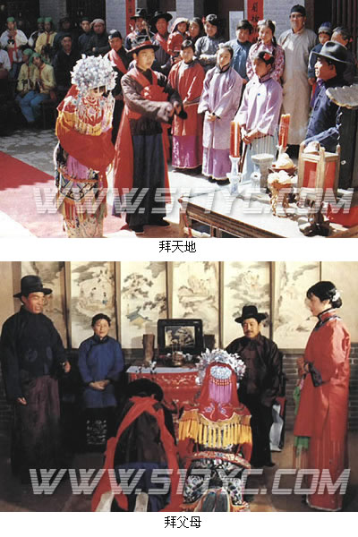 新郎、新娘进门后,接着就要“拜堂”,又称“拜天地”。拜堂的地方一般在洞房门前,设一张供桌,上面供有天地君亲师的牌位,供桌后方悬挂祖宗神幔。新郎、新娘就位后,由两位男宾唱导,行三跪九叩礼,参拜天地、祖宗和父母。然后女东男西,行夫妻对拜礼。雁北大同一带,拜堂时新郎拜,新娘却不拜,与常俗殊为不同。